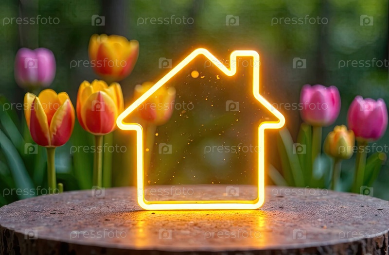 Прозрачное золото светящийся символ дома стол с весенним цветущим солнечным фоном. недвижимость, риэлторская деятельность, ипотека, страхование, бронирование, строительство, изоляция. AI generated