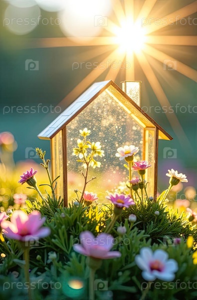 Крошечный эко-дом теплица в солнечных лучах, с весенними цветами на весеннем пастельном фоне. недвижимость, дача, летний дом, ипотека, страхование, бронирование, строительство, изоляция. ИИ генерируется