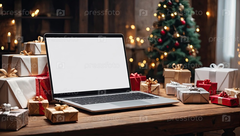 Ноутбук с белым экраном макет на столе в офисе рождественского декора с подарочными коробками для сотрудников, магазины, корпоративные подарки, Черная пятница,