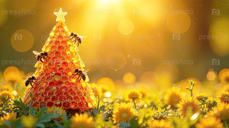 Мед в сосудах в форме конуса рождественской елки с пчелами на летнем поле под солнечным светом.Пчеловодство, Рождество, Новый год.Искусственный интеллект создан