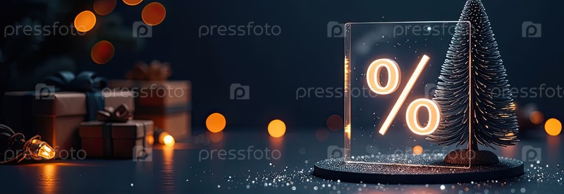 Неон светящийся золотой процентный знак на рождественском фоне с елкой, блесками и коробками для подарков. Черная пятница, Новый год, Рождественская распродажа, скидки. баннер, флаер с копировальным пространством. ИИ генерируется