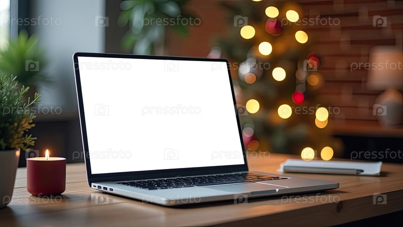 Ноутбук с белым экраном макет на столе в уютном кафе в стиле лофт со стаканом кофе, домашний офис рождественского декора