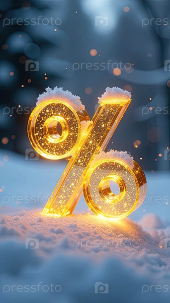 Неон светящийся золотой процентный знак на снежном фоне снаружи, блеск и снежинки. Зимняя распродажа и скидки, Черная пятница, Новый год, Рождество. баннер, флаер с копировальным пространством. ИИ генерируется