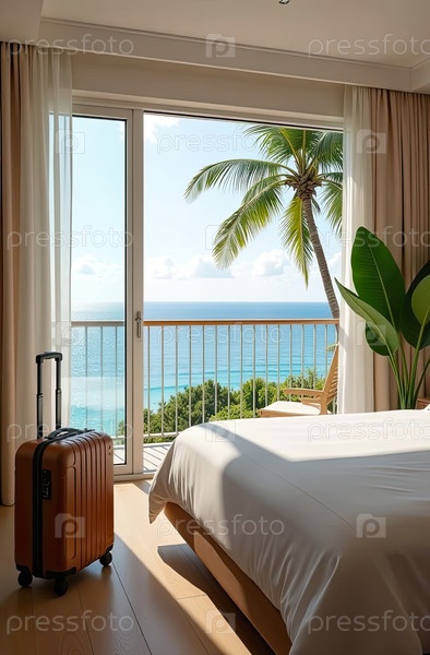 Интерьер гостиничного номера с видом на океан для пляжного отдыха и путешествий