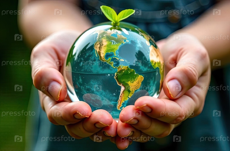 Светящаяся стеклянная сфера планеты Земля с зелеными растениями, растущими в руках детей, забота о планете, чистая окружающая среда, защита экологии, зеленая планета
