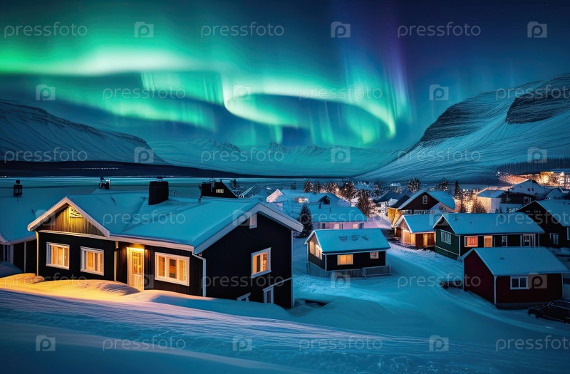 Северные огни в небе над северной деревней со снежными уютными домами зимой