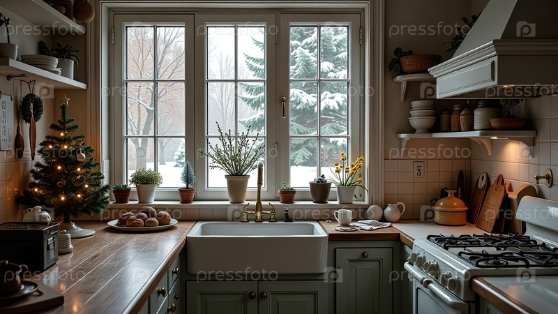 Верхний интерьер уютной современной рождественской кухни, новогоднее настроение, подготовка к празднику, посуда. Рождественский декор современной кухни, снег снаружи окна. ИИ генерируется