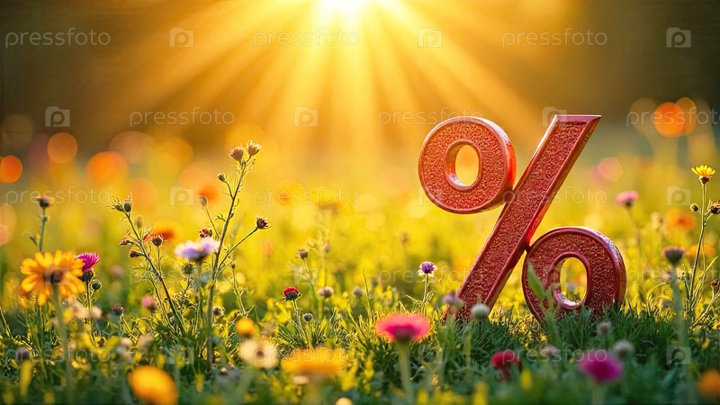 Процентный знак в солнечных лучах, украшен летними цветами. Летняя распродажа и скидки, экология, чистая природа, баннер летнего времени, флаер с копировальным пространством. ИИ генерируется