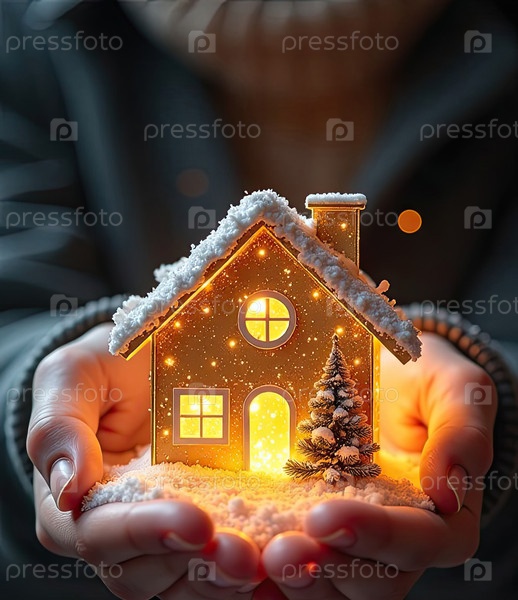 Золото светящийся символ уютного дома на снегу В ладонях рук с золотым блеском. Недвижимость, риэлтор, ипотека, страхование, бронирование, зимовка, изоляция, отопление. ИИ генерируется