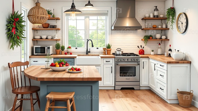 Белый интерьер уютной современной светлой деревенской кухни, горшечные растения, открытые полки для хранения посуды