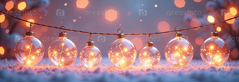 Гирлянда светящихся прозрачных шаров с золотыми огнями на фиолетовом фоне с блестками и боке. поздравительная карточка на Рождество и Новый год. ИИ генерируется