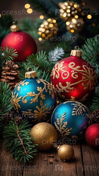 Рождественская открытка с кописпейсом на уютном деревянном столе с елкой, рождественскими шарами, свечами, конусами и блестками
