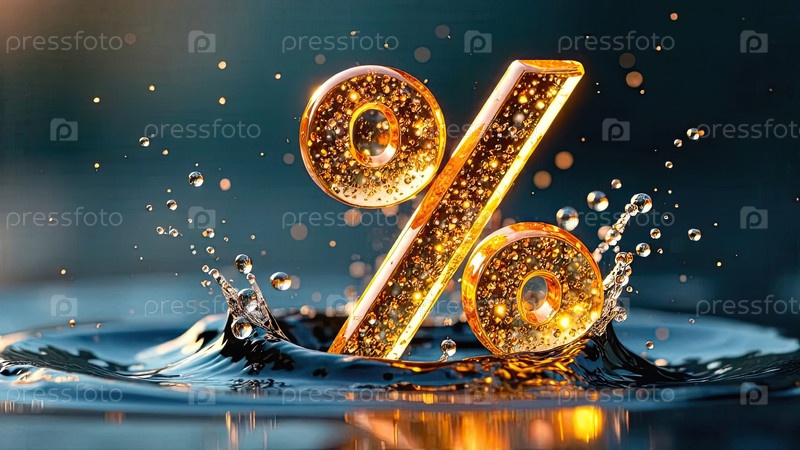 Светящийся золотой процентный знак в освежающем брызге воды над водой. жаркие летние распродажи и скидки, горящие баннеры туров, листовки. ИИ генерируется