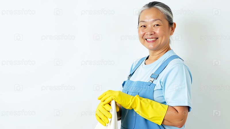 Портрет взрослой азиатской женщины в синем фартуке и желтых резиновых перчатках с тряпкой в руке возле белой стены со свободным местом для текста, услуги очистки окон, уборки дома, горничной