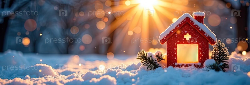 Уютный каркас крошечный дом на снегу и заснеженном фоне в солнечных лучах, с рождественским декором. недвижимость, риэлторская деятельность, ипотека, страхование, бронирование, зимовка, изоляция, отопление. ИИ генерируется