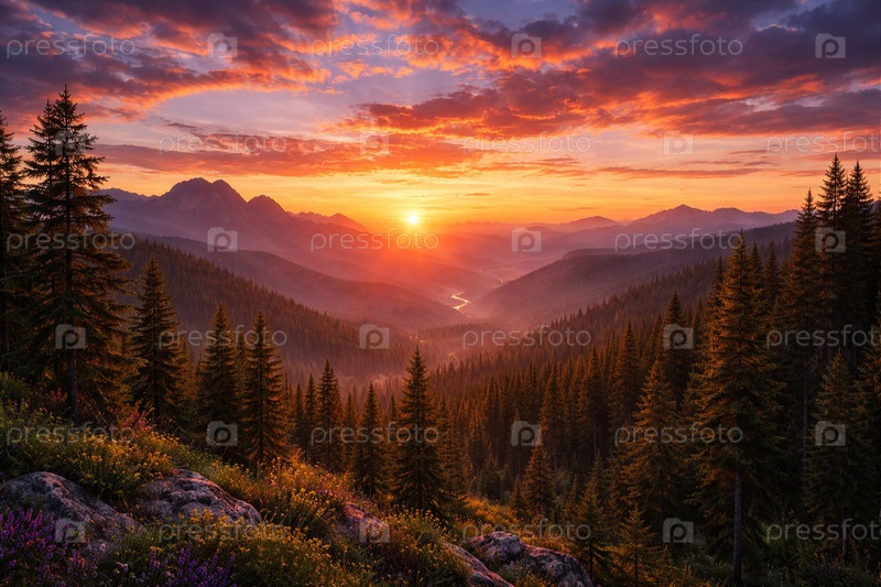 Закат солнца в горах с лесом и рекой
