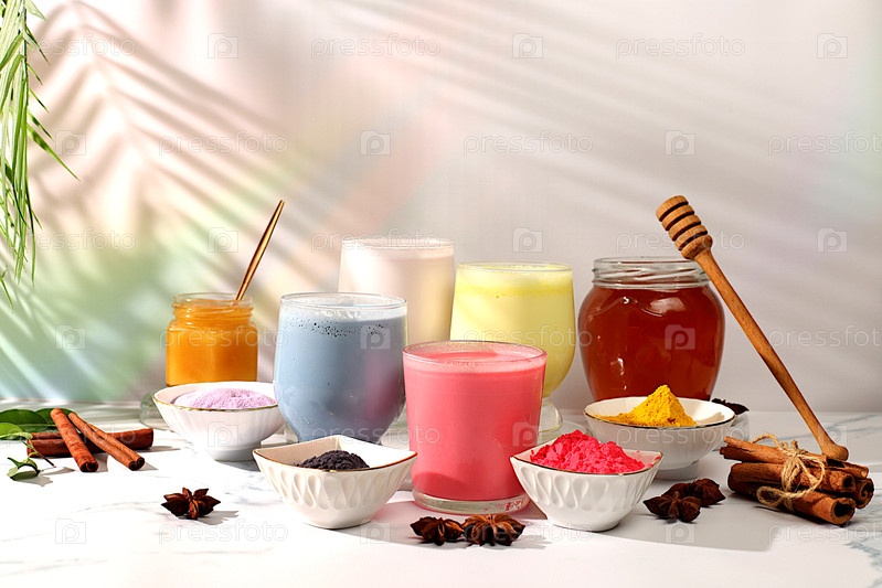 Разнообразие красочного мача-латте, японского чая, золотой куркумы, лавандового синего и розового лунного молока, модный здоровый напиток способствует потере веса, расслабляющий напиток перед сном, имеет противовоспалительные свойства