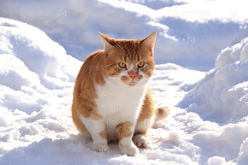 Пушистый красноволосый бродячий кот сидит на снежной тропе. Сильные зимние морозы не пугают сибирских кошек, которые не боятся холода. Понятие сострадания и помощи бездомным животным