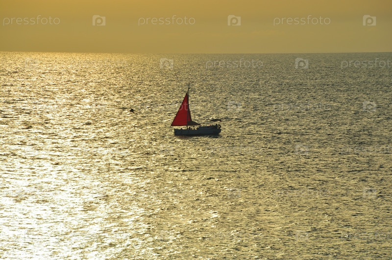Маленькое парусное судно в море на закате