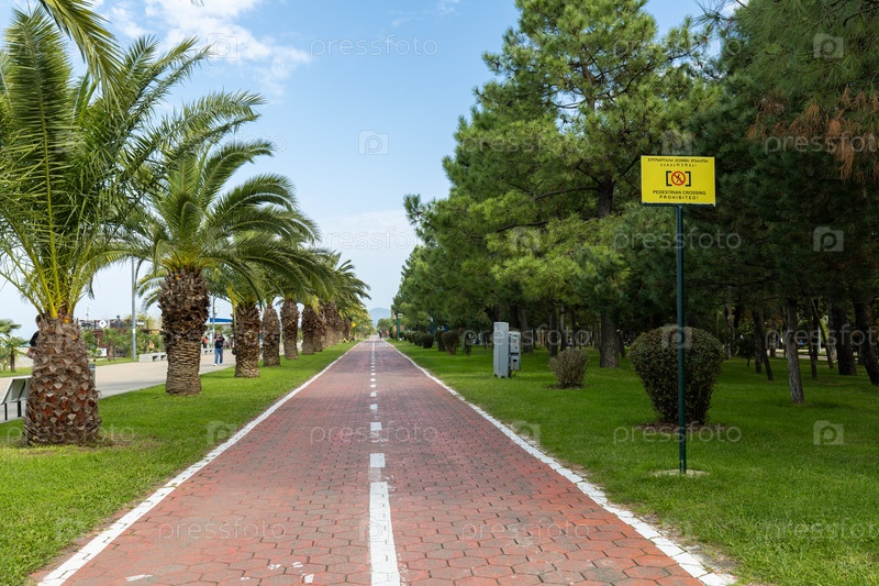 Вид на велосипедную дорожку вдоль красивой многокилометровой набережной Батуми, города и порта в Грузии, расположенного на побережье Черного моря. ландшафт городского парка