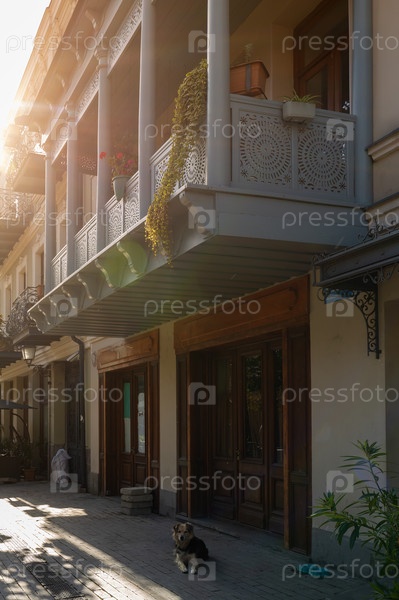 Фасад с деревянным балконом старого красивого дома в Тбилиси