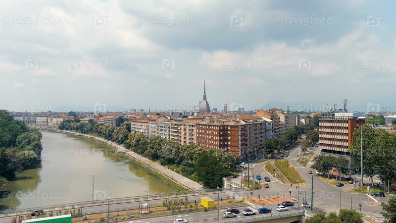 Турин, Италия. шпиль Молы Антонеллианы. Моли Антонеллианы - величественное здание XIX века. Панорама города. Летний день, вид с воздуха