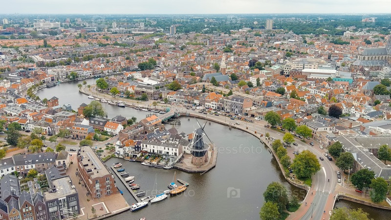 Ветряная мельница De Adriaan (1779). ветряная мельница XVIII века. панорамный вид на центр города Haarlem. облачная погода в течение дня. лето, Aerial View