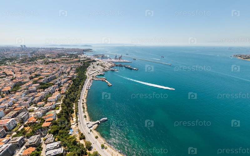 Стамбул, Турция.Порт Ускудар на азиатском побережье в месте слияния Босфора и Мраморного моря.Вид из воздуха оживленной береговой линии и активного морского транспорта в летний полдень.Вонный вид