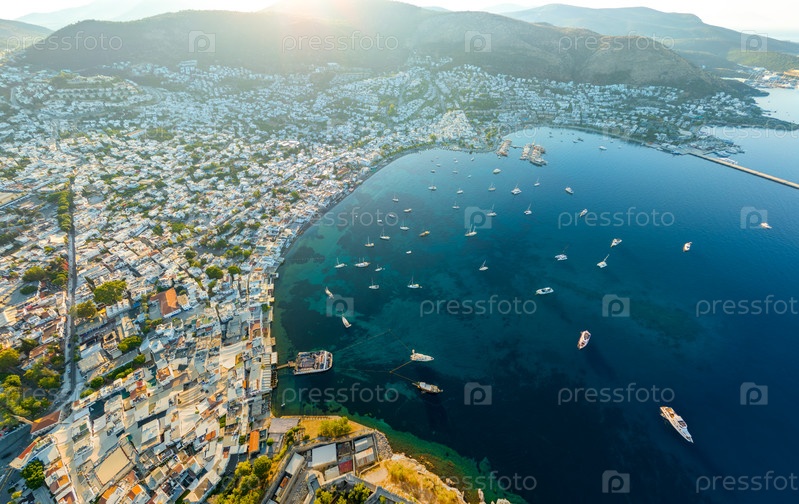 Широкая утренняя панорама пляжей, бухты с яхтами, белые дома и туманные горы в атмосферном утреннем свете