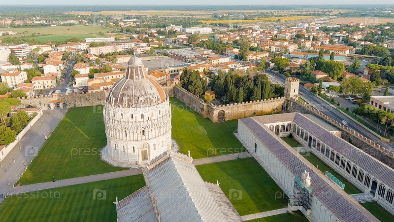 Пиза, Италия. Знаменитый город с наклонной башней. Пизанский собор в Пьяцца-де-Мираколи. Лето. Утренние часы, Aerial View Pisa