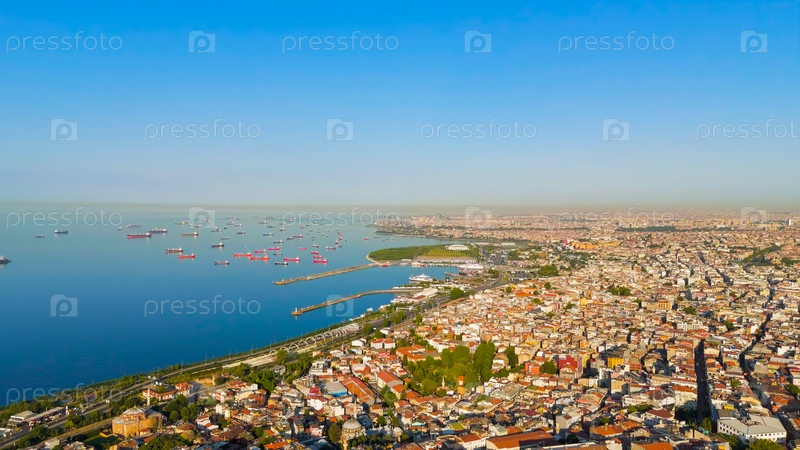 Панорамный вид Босфорского пролива и Золотого Рога с кораблями, мостами и горизонтом города под голубым утренним небом