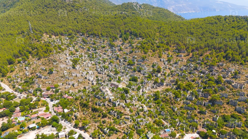 Широкий воздушный снимок дрона заброшенного города-призрака руины, простирающиеся по склонам гор под ярким солнцем