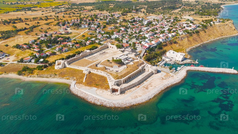 Доминирующая крепость Сэдд аль-Бахр с видом на прибрежную деревню и Дарданелльский пролив из воздушной точки зрения в солнечный день