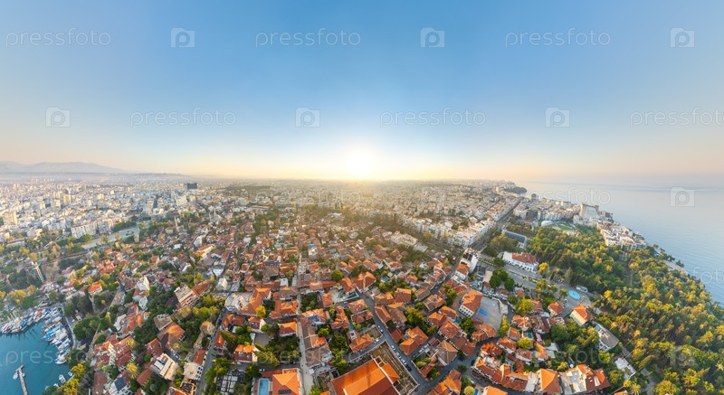Широкая воздушная панорама, контрастирующая исторический Старый город Калейчи на переднем плане с современным горизонтом города и Средиземным морем вдоль береговой линии летом утром