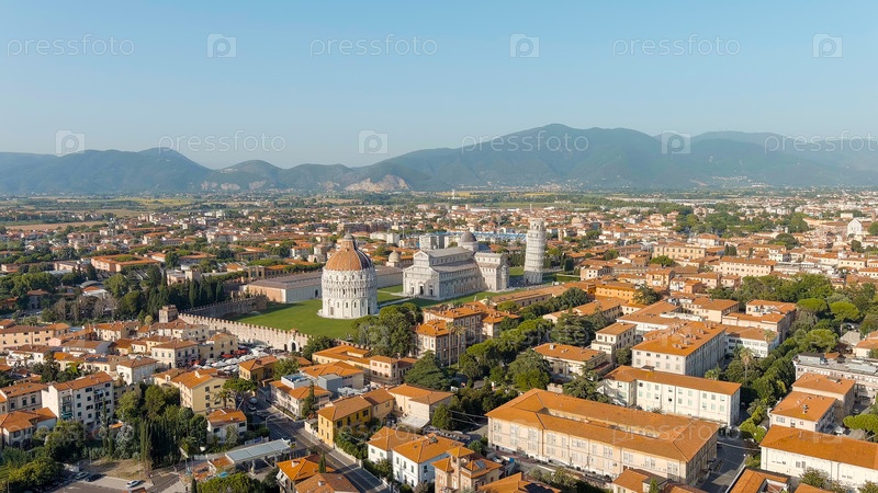 Пиза, Италия. знаменитая наклонная башня и пизанский собор в Пьяцце-дей-Мираколи. лето. вечерние часы, взгляд с воздуха