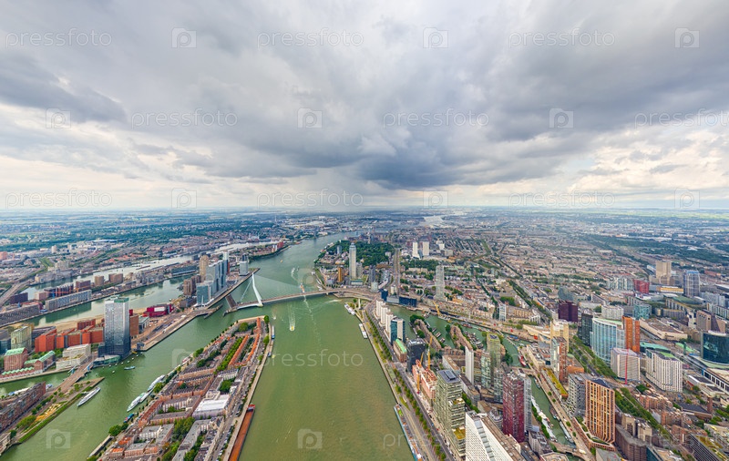 Роттердам, Нидерланды Панорама летнего города в дождливую погоду. Облака. Вид с воздуха