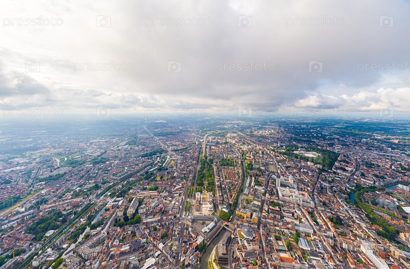 Гент, Бельгия. Центр города и его окрестности. Жилые и промышленные районы. Панорама на город. Летний день, облачная погода. Вид с воздуха