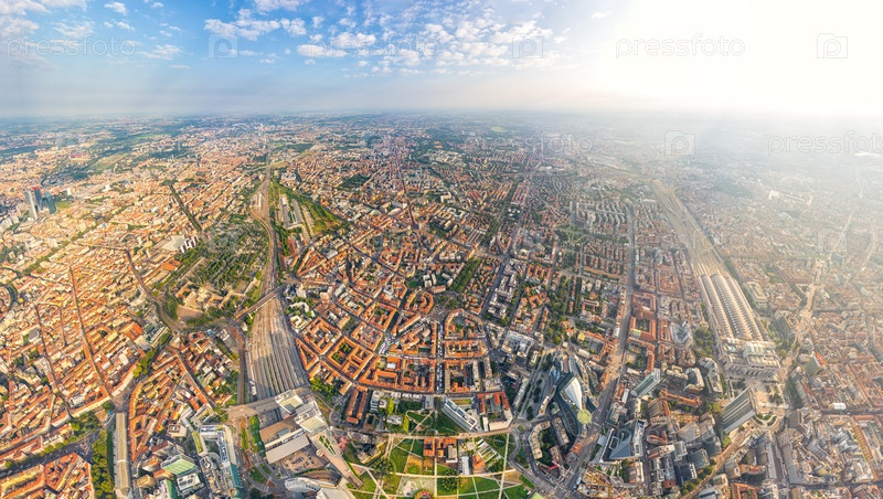 Милан, Италия Ботанический сад и небоскребы Панорама центральной части города Летний облачный день Вид с воздуха