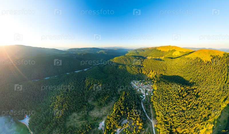 Абант - большое пресноводное озеро, окруженное горами и лесом с живописным видом. время захода солнца. летний пейзаж. вид из воздуха