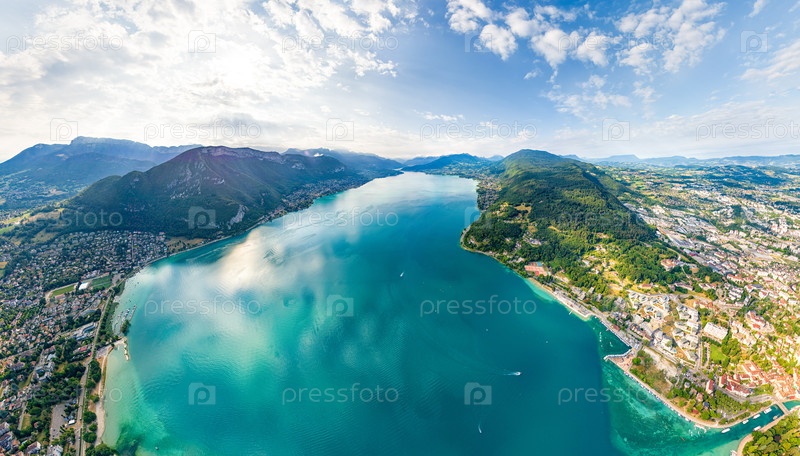 Озеро Аннеси с окружающими горами и деревнями Панорама летом Французские Альпы Вид с воздуха