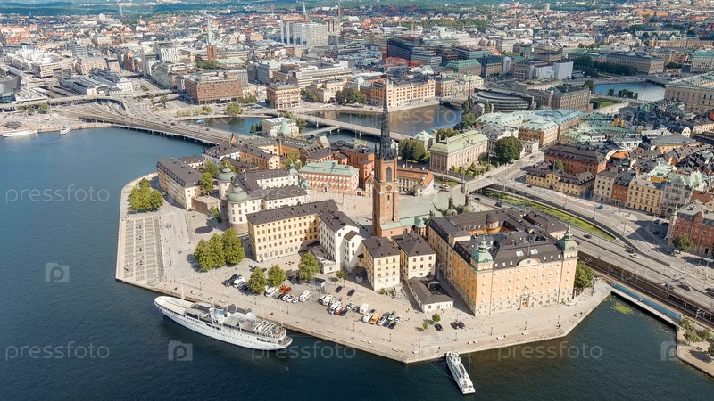 Стокгольм, Швеция. Остров Риддархольмен и озеро Маларен. Церковь Риддархольмена. Панорама города. Летний день, взгляд с воздуха
