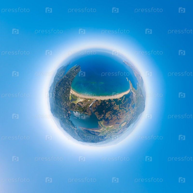 Дальян, Турция.Креативный вид астероида сферическая панорама над пляжем Изтузу показывает изогнутый пейзаж с горами и далекими горизонтами 360 градусов воздушная панорамная астероид