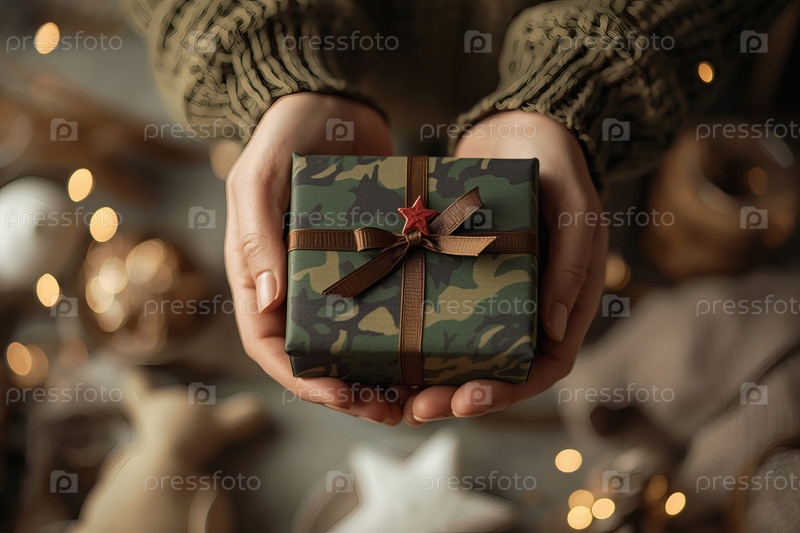 Близкий план женских рук, держащих подарок на День защитника Отечества в камуфляжной упаковке с атласной лукой. концепция праздника 23 февраля