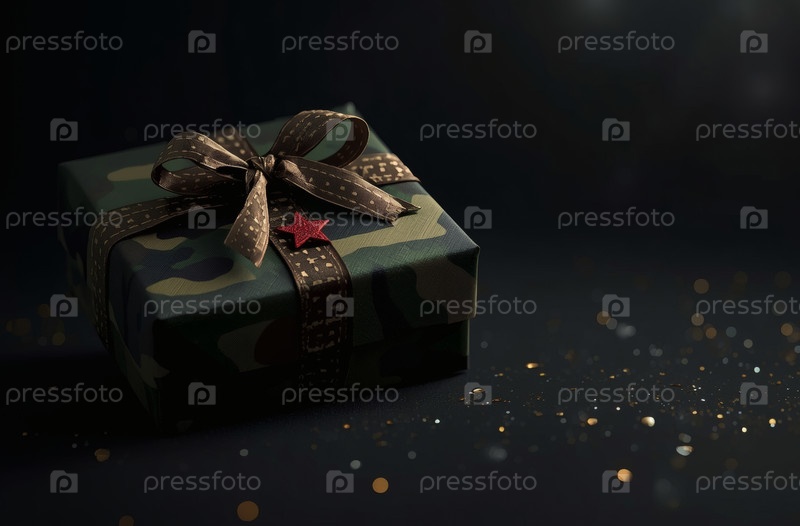 Подарочная коробка камуфляжного цвета с праздничной атласной ленточкой на темном фоне.Концепция празднования Дня защитника Отечества 23 февраля