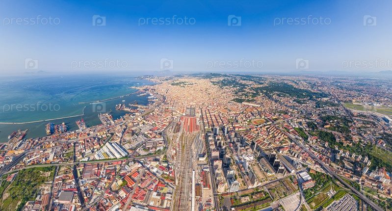Неаполь, Италия. Железнодорожный вокзал - Napoli Centrale. Неаполитанская бухта с кораблями. Панорама города в летний день. Солнечная погода. Вид из воздуха