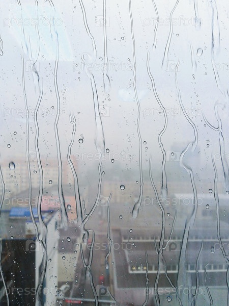 Капли дождя и полосы воды на стекле окна с размытыми зданиями города на заднем плане, абстрактное городское погодное настроение