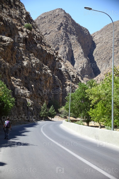 Горная дорога под шероховатыми засушливыми склонами возле горы Маркау в Ашхабаде, Туркменистан