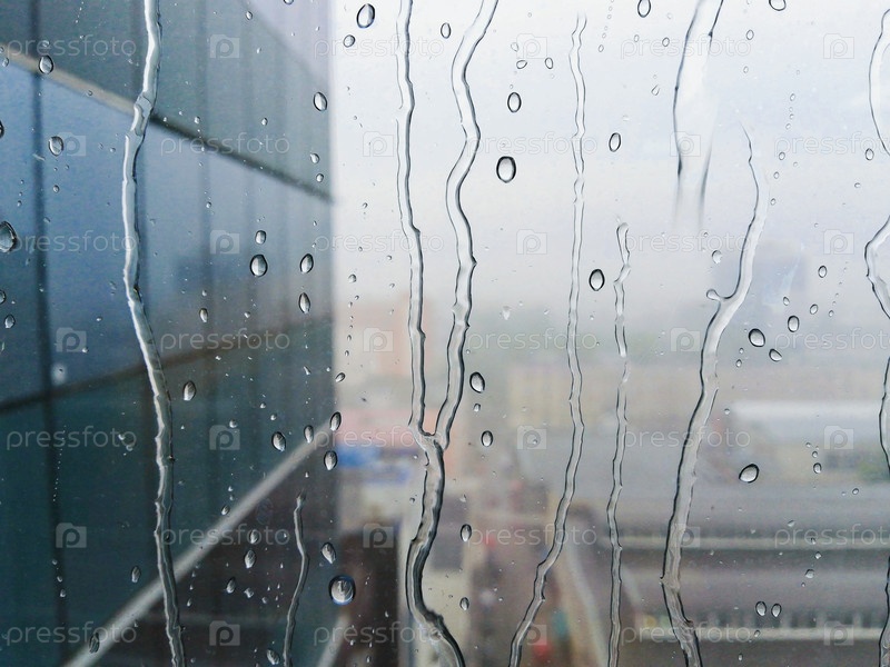 Капли дождя и полосы воды на стекле окна с размытыми зданиями города на заднем плане, абстрактное городское погодное настроение