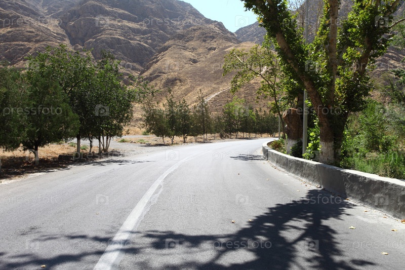 Горная дорога под шероховатыми засушливыми склонами возле горы Маркау в Ашхабаде, Туркменистан