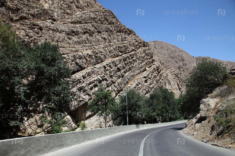 Горная дорога под шероховатыми засушливыми склонами возле горы Маркау в Ашхабаде, Туркменистан